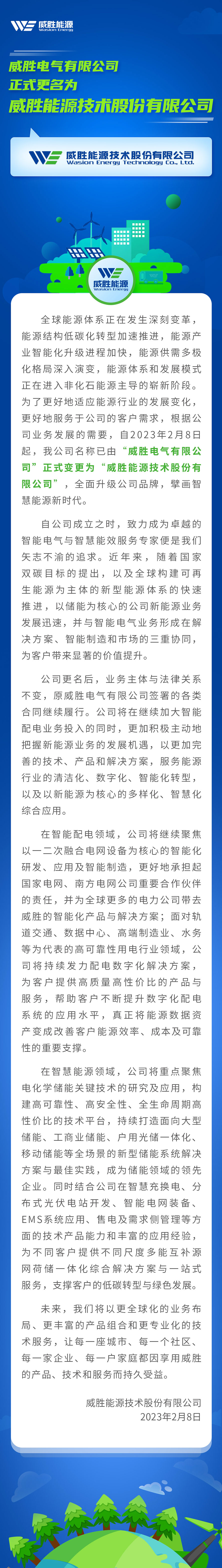 全球能源體系正在發(fā)生深刻變革,能源結(jié)構(gòu)低碳化轉(zhuǎn)型加速推進(jìn),能源產(chǎn)業(yè)智能化升級進(jìn)程加快,能源供需多極化格局深入演變,能源體系和發(fā)展模式正在進(jìn)入非化石能源主導(dǎo)的嶄新階段。為了更好地適應(yīng)能源行業(yè)的發(fā)展變化,更好地服務(wù)于公司的客戶需求,根據(jù)公司業(yè)務(wù)發(fā)展的需要,自2023年2月8日起,我公司名稱已由“威勝電氣有限公司”正式變更為“惟遠(yuǎn)能源技術(shù)股份有限公司”,全面升級公司品牌,擘畫智慧能源新時代。