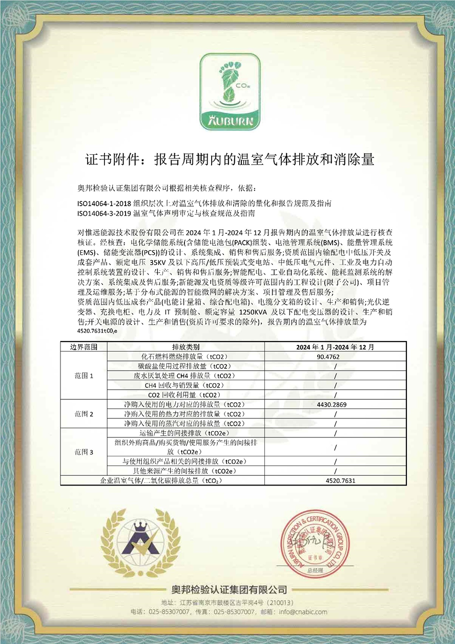 近日,通過奧邦檢驗認證集團有限公司的核查,依據ISO14064-1-2018組織層次上對溫室氣體排放和清除的量化和報告規范及指南及ISO14064-3-2019溫室氣體聲明審定與核查規范及指南,惟遠能源技術股份有限公司的溫室氣體清單(2024.1-2024.12)符合ISO14064-1-2018、ISO14064-3-2019標準要求,在2024年度總排放量為:4520.7631噸二氧化碳當量。順利獲得溫室氣體核查聲明。