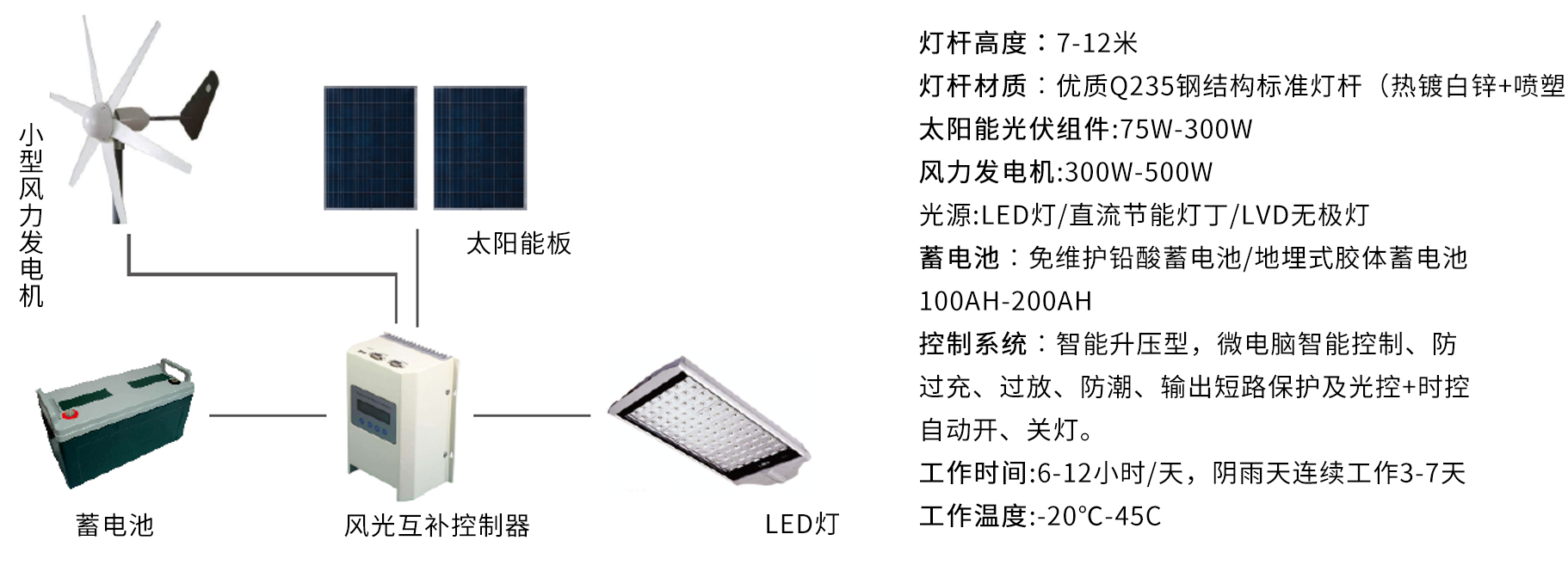 5、控制系統(tǒng):控制系統(tǒng),同時實現(xiàn)光效控制和時間控制,具備過充、過放、過載、欠壓、保護等智能控制功能。此外,低電壓升壓充電系統(tǒng),在風(fēng)力發(fā)電和太陽能發(fā)電電壓小于24V大于15V的情況下,對這部分電能升壓到24V以上以充分利用。